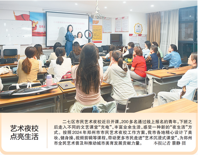 二七区市民艺术夜校近日开课,200多名通过线上报名的青年,下班之后走入不同的文艺课堂“充电”,丰富业余生活,感受一种新的“夜生活”方式。按照2024年郑州市市民艺术夜校工作方案,我市各地精心设计了美妆、健身操、视频剪辑等课程,带动更多市民走进“艺术沉浸式课堂”,为郑州市全民艺术普及和推动城市美育发展贡献力量。(今日《郑州日报》1版)