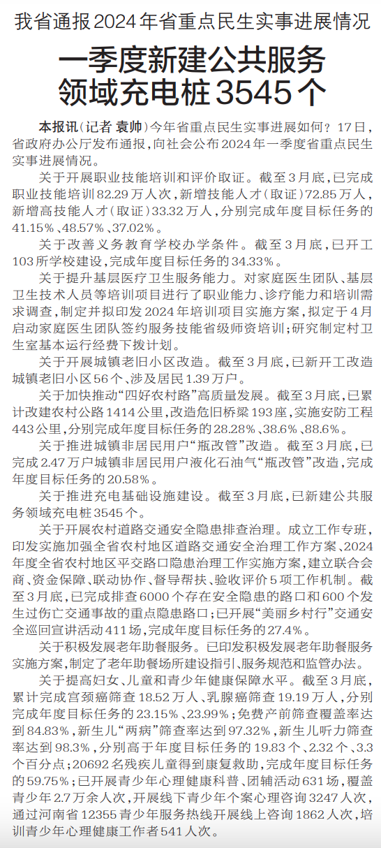 今年省重点民生实事进展如何?17日,省政府办公厅发布通报,向社会公布2024年一季度省重点民生实事进展情况。(今日《郑州日报》2版)