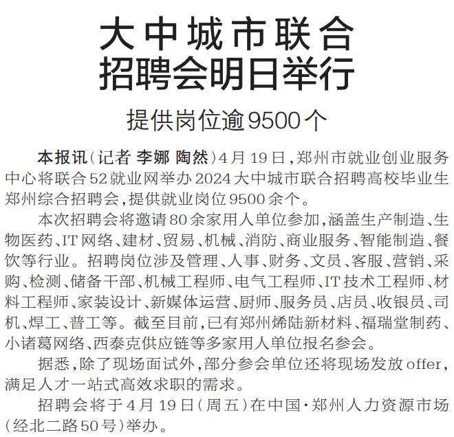 4月19日,郑州市就业创业服务中心将联合52就业网举办2024大中城市联合招聘高校毕业生郑州综合招聘会,提供就业岗位9500余个。(今日《郑州日报》2版)