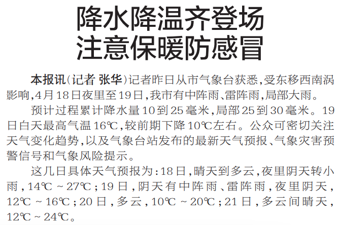 记者昨日从市气象台获悉,受东移西南涡影响,4月18日夜里至19日,我市有中阵雨、雷阵雨,局部大雨。(今日《郑州日报》2版)