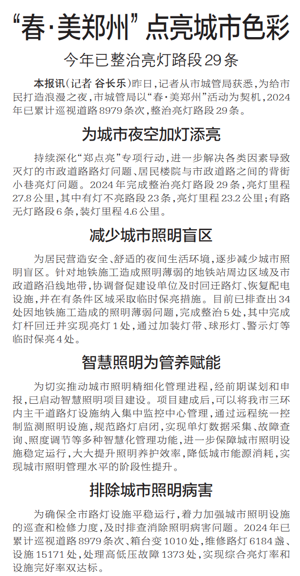 昨日,记者从市城管局获悉,为给市民打造浪漫之夜,市城管局以“春·美郑州”活动为契机,2024年已累计巡视道路8979条次,整治亮灯路段29条。(今日《郑州日报》5版)
