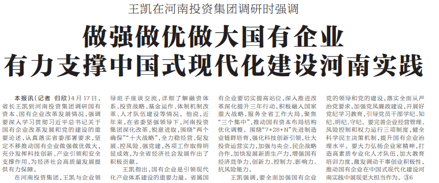 4月17日,省长王凯到河南投资集团调研国有资本、国有企业改革发展情况,强调要深入学习贯彻习近平总书记关于国有企业改革发展和党的建设的重要论述,认真落实省委部署要求,坚定不移推动国有企业做强做优做大,充分发挥科技创新、产业引领和安全支撑作用,为经济社会高质量发展提供有力保障。(今日《河南日报》1版)