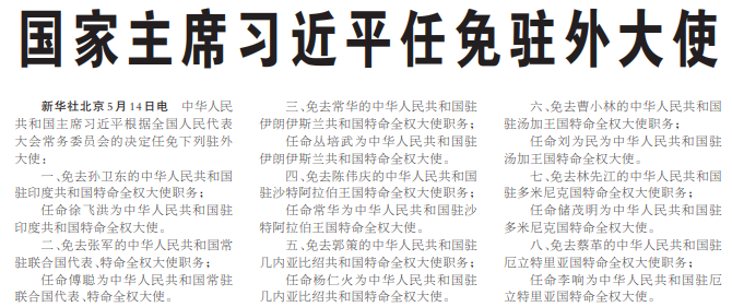 中华人民共和国主席习近平根据全国人民代表大会常务委员会的决定任免下列驻外大使: