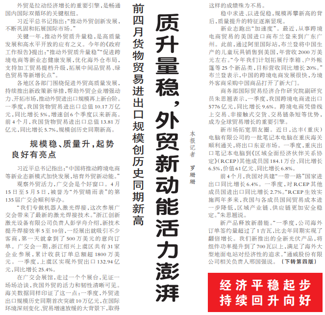 关键一年,推动外贸质升量稳,是高质量发展和高水平开放的应有之义。今年的《政府工作报告》提出:“推动外贸质升量稳”“促进跨境电商等新业态健康发展,优化海外仓布局,支持加工贸易提档升级,拓展中间品贸易、绿色贸易等新增长点”。(今日《人民日报》1版、4版)
