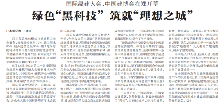 5月13日,2024(第二十届)国际绿色建筑与建筑节能大会暨新技术与产品博览会、中国(郑州)建筑产业与智能建造博览会同时在郑州国际会展中心开幕,领域内的“黑科技”琳琅满目。(今日《河南日报》2版)