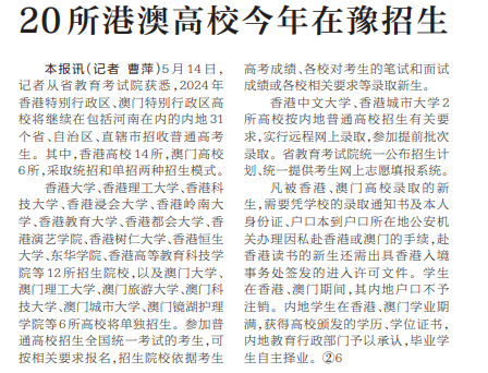 5月14日,记者从省教育考试院获悉,2024年香港特别行政区、澳门特别行政区高校将继续在包括河南在内的内地31个省、自治区、直辖市招收普通高考生。其中,香港高校14所,澳门高校6所,采取统招和单招两种招生模式。(今日《河南日报》2版)