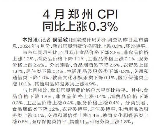 国家统计局郑州调查队昨日发布信息,2024年4月份,我市居民消费价格同比上涨0.3%,环比持平。