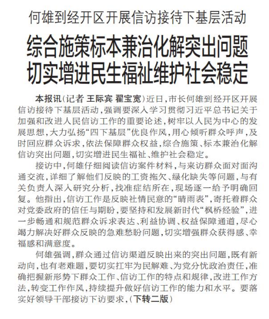 近日,市长何雄到经开区开展信访接待下基层活动,强调要深入学习贯彻习近平总书记关于加强和改进人民信访工作的重要论述,树牢以人民为中心的发展思想,大力弘扬“四下基层”优良作风,用心倾听群众呼声,及时回应群众诉求,依法保障群众权益,综合施策、标本兼治化解信访突出问题,切实增进民生福祉、维护社会稳定。(今日《郑州日报》1版、2版)