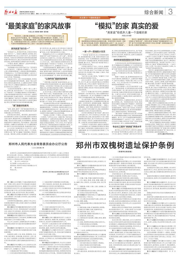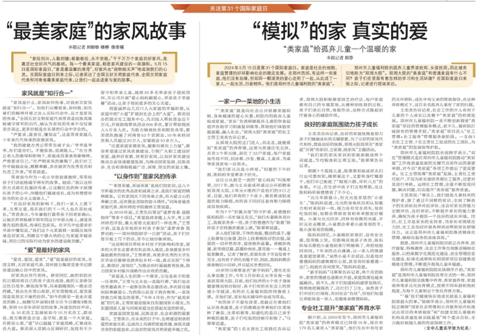 2024年5月15日是第31个国际家庭日。家庭是社会的细胞,家庭管理的好坏影响社会的稳定发展。在郑州西郊,有这样一些家庭,他们没有血缘,但却因一颗滚烫的爱心走到了一起,从此成了一家人,一起生活,日夜相伴。他们是郑州市儿童福利院的“类家庭”。(今日《郑州日报》3版)