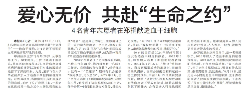 5月13日、14日,4名青年志愿者在郑州相继捐献“生命种子”——造血干细胞,为4名素不相识的血液病患者续写生的希望。(今日《郑州日报》5版)