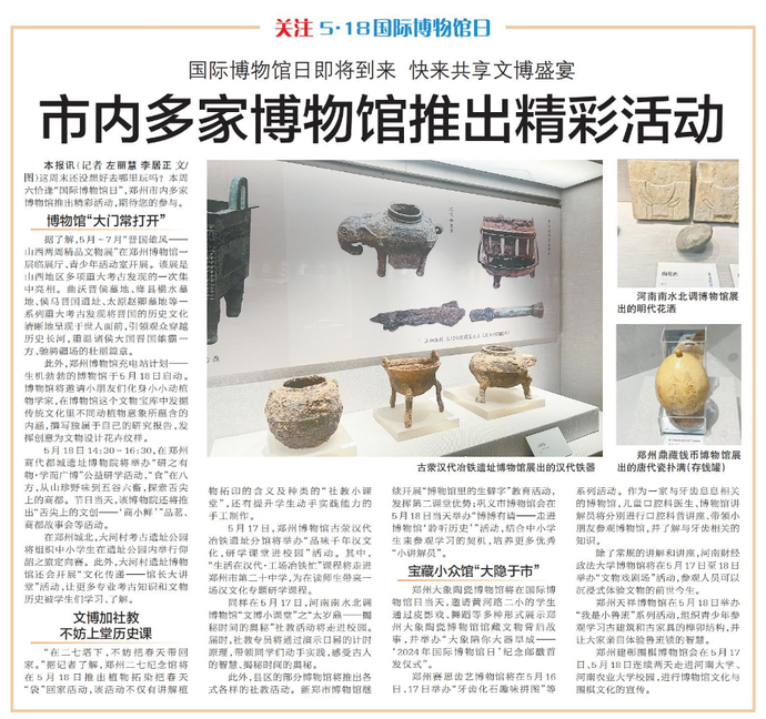 这周末还没想好去哪里玩吗?本周六恰逢“国际博物馆日”,郑州市内多家博物馆推出精彩活动,期待您的参与。(今日《郑州日报》8版)