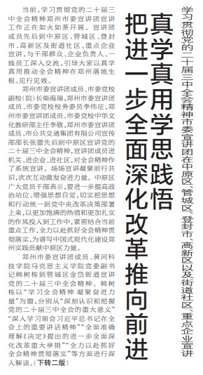 学习贯彻党的二十届三中全会精神市委宣讲团在中原区、管城区、登封市、高新区以及街道社区、重点企业宣讲