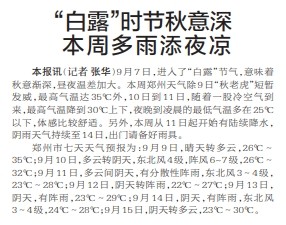 9月7日,进入了“白露”节气,意味着秋意渐深,昼夜温差加大。本周郑州天气除9日“秋老虎”短暂发威,最高气温达35℃外,10日到11日,随着一股冷空气到来,最高气温降到30℃上下,夜晚到凌晨的最低气温多在25℃以下,体感比较舒适。另外,本周从11日起开始有陆续降水,阴雨天气持续至14日,出门请备好雨具。(今日《郑州日报》1版)