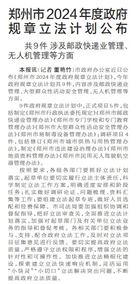 市政府办公室近日公布《郑州市2024年度政府规章立法计划》,今年政府规章立法计划共9件,内容涉及邮政快递业管理、大型群众性活动安全管理、无人机管理等方面。(今日《郑州日报》2版)