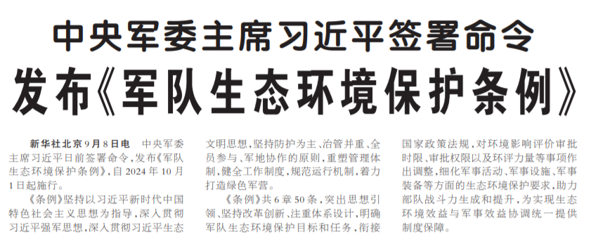 中央军委主席习近平日前签署命令,发布《军队生态环境保护条例》,自2024年10月1日起施行。(今日《人民日报》1版)