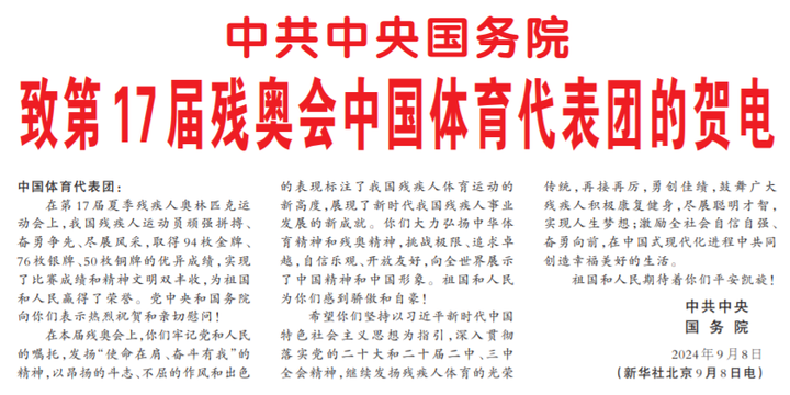 在第17届夏季残疾人奥林匹克运动会上,我国残疾人运动员顽强拼搏、奋勇争先、尽展风采,取得94枚金牌、76枚银牌、50枚铜牌的优异成绩,实现了比赛成绩和精神文明双丰收,为祖国和人民赢得了荣誉。党中央和国务院向你们表示热烈祝贺和亲切慰问!(今日《人民日报》1版)