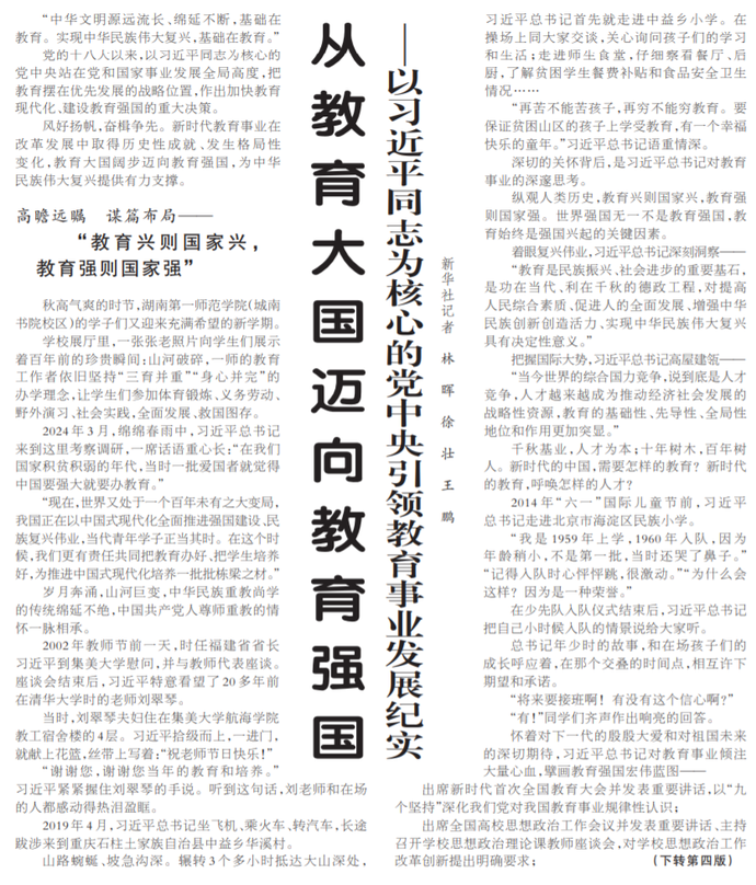 党的十八大以来,以习近平同志为核心的党中央站在党和国家事业发展全局高度,把教育摆在优先发展的战略位置,作出加快教育现代化、建设教育强国的重大决策。(今日《人民日报》1版、4版)
