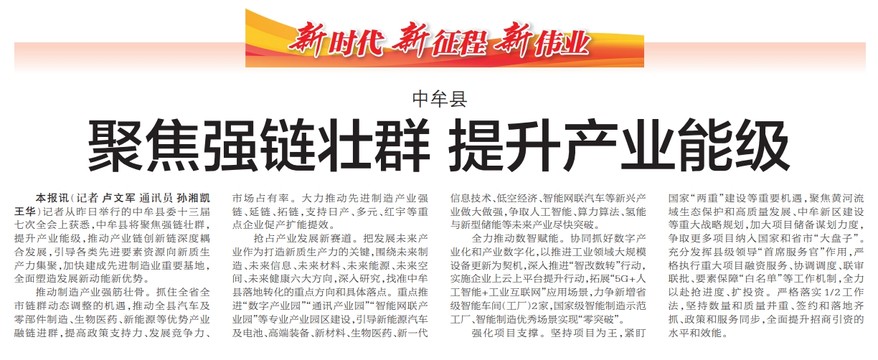 记者从昨日举行的中牟县委十三届七次全会上获悉,中牟县将聚焦强链壮群,提升产业能级,推动产业链创新链深度耦合发展,引导各类先进要素资源向新质生产力集聚,加快建成先进制造业重要基地,全面塑造发展新动能新优势。(今日《郑州日报》6版)
