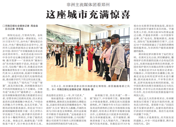 相知无远近,万里尚为邻。金秋时节,商都郑州迎来一群新朋友。8月31日至9月7日,由中央广播电视总台主办,中央广播电视总台亚非中心、郑州市人民政府新闻办公室承办的“漫步中国·郑州行”中非媒体联合采访活动在郑州举行。本次活动是2024年中非合作论坛峰会配套活动“文明交响 数字筑梦——‘非洲伙伴’媒体行动”在河南开展的子活动,肯尼亚广播公司、马拉维广播公司、坦桑尼亚非洲媒体集团等东非11家主流媒体和机构代表16人来到河南,拓展中非媒体交流合作,感受中国式现代化取得的成就,推动数字时代下的文明交流互鉴。(今日《河南日报》2版)