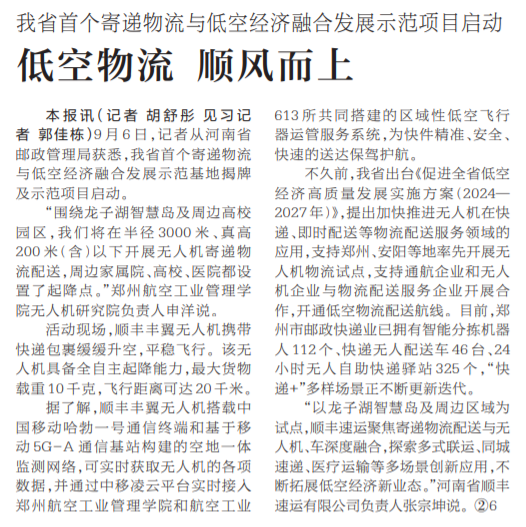 9月6日,记者从河南省邮政管理局获悉,我省首个寄递物流与低空经济融合发展示范基地揭牌及示范项目启动。(今日《河南日报》2版)