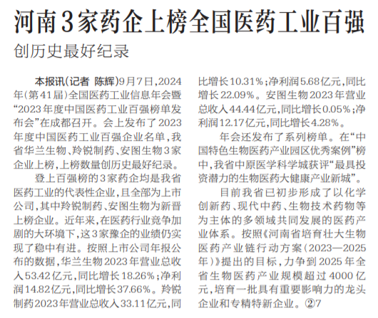 9月7日,2024年(第41届)全国医药工业信息年会暨“2023年度中国医药工业百强榜单发布会”在成都召开。会上发布了2023年度中国医药工业百强企业名单,我省华兰生物、羚锐制药、安图生物3家企业上榜,上榜数量创历史最好纪录。(今日《河南日报》2版)