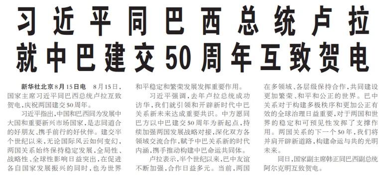 8月15日,国家主席习近平同巴西总统卢拉互致贺电,庆祝两国建交50周年。