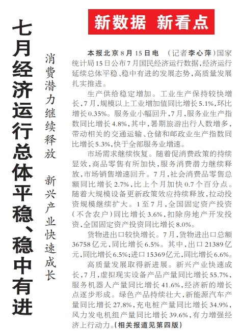 国家统计局15日公布7月国民经济运行数据,经济运行延续总体平稳、稳中有进的发展态势,高质量发展扎实推进。