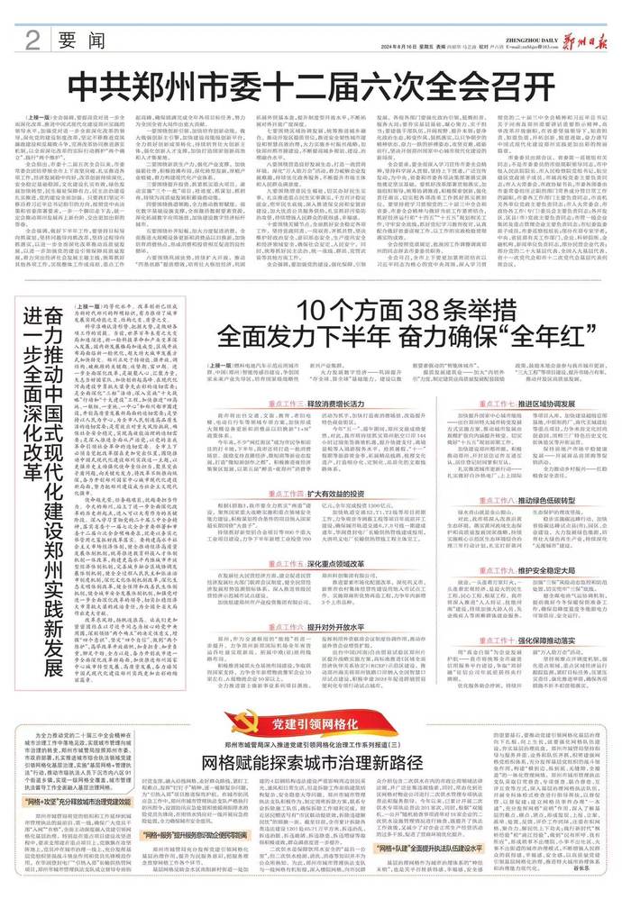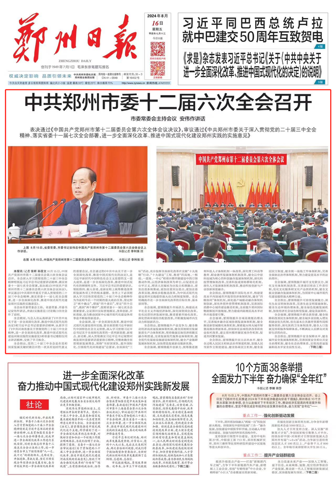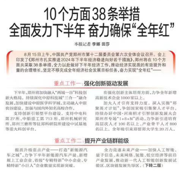 8月15日上午,中国共产党郑州市第十二届委员会第六次全体会议召开。会上印发了《郑州市扎实推进2024年下半年经济稳进向好若干措施》,郑州将在10个方面共采取38条举措,全力以赴做好下半年经济工作,推动经济实现质的有效提升和量的合理增长,坚定不移完成全年经济社会发展目标任务,奋力实现“全年红”——(今日《郑州日报》1版、2版)