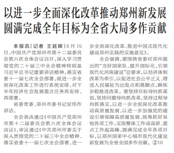 8月15日,中国共产党郑州市第十二届委员会第六次全体会议召开,深入学习贯彻党的二十届三中全会精神特别是习近平总书记重要讲话精神,落实省委十一届七次全会部署,就进一步全面深化改革工作进行系统安排,对下半年经济社会发展重点任务再安排、再部署。(今日《河南日报》2版)