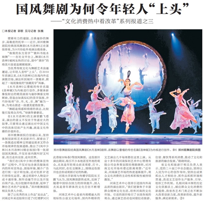 “极致的东方美学”“教科书级水袖舞”……在社交平台上,舞剧《水月洛神》被网友热烈讨论,剧中“落纱”的绝美片段更是频频刷屏。(今日《河南日报》2版)