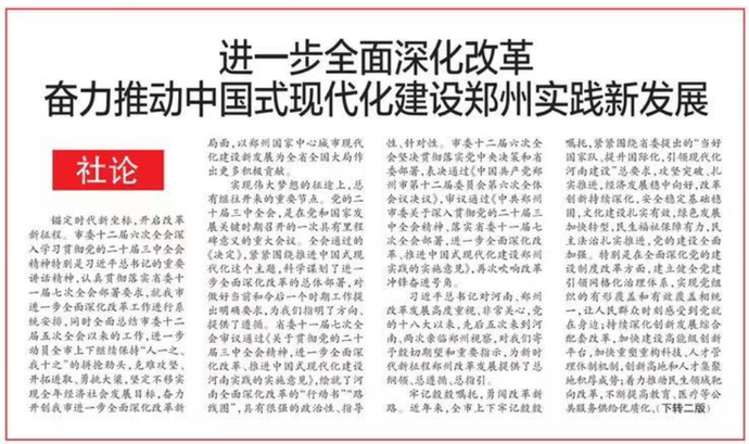 锚定时代新坐标,开启改革新征程。市委十二届六次全会深入学习贯彻党的二十届三中全会精神特别是习近平总书记的重要讲话精神,认真贯彻落实省委十一届七次全会部署要求,就我市进一步全面深化改革工作进行系统安排,同时全面总结市委十二届五次全会以来的工作,进一步动员全市上下继续保持“人一之、我十之”的拼抢劲头,克难攻坚、开拓进取、勇挑大梁,坚定不移实现全年经济社会发展目标,奋力开创我市进一步全面深化改革新局面,以郑州国家中心城市现代化建设新发展为全省全国大局作出更多积极贡献。(今日《郑州日报》1版、2版)
