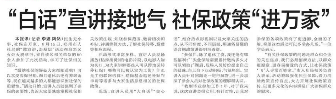 民生无小事,社保连万家。8月15日,郑州市人社局的“微宣讲,走基层”活动在高新区火炬大厦举行,来自该区相关单位的50余人参加了此次活动,学习了社保相关知识。(今日《郑州日报》5版)