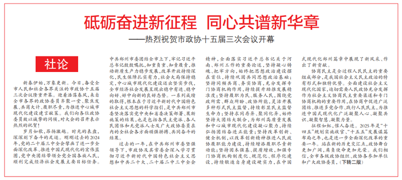 新春伊始,万象更新。今日,备受全市人民和社会各界关注的市政协十五届三次会议隆重开幕。迎着浩荡春风,来自全市各界的政协委员齐聚一堂、聚焦发展、共商大计、履职尽责,为推进中心城市现代化建设建言献策。我们向各位政协委员致以诚挚的问候,对大会的召开表示热烈的祝贺!(今日《郑州日报》1版、2版)