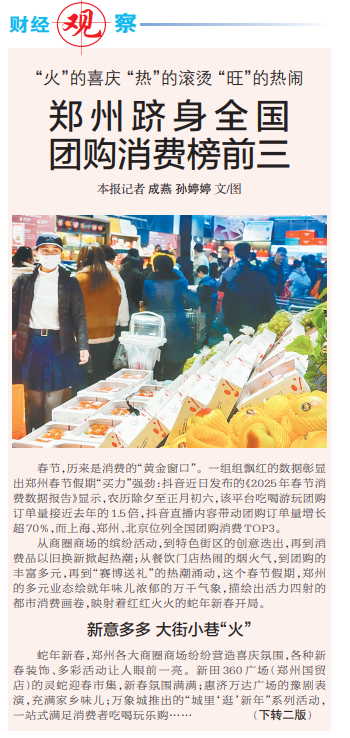 春节,历来是消费的“黄金窗口”。一组组飘红的数据彰显出郑州春节假期“买力”强劲:抖音近日发布的《2025年春节消费数据报告》显示,农历除夕至正月初六,该平台吃喝游玩团购订单量接近去年的1.5倍,抖音直播内容带动团购订单量增长超70%,而上海、郑州、北京位列全国团购消费TOP3。(今日《郑州日报》1版、2版)