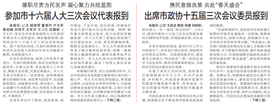 郑州进入一年一度的“两会时间”。2月6日,参加市政协十五届三次会议的政协委员们携带民声民意、怀揣发展良策,向大会报到。(今日《郑州日报》1版、2版)