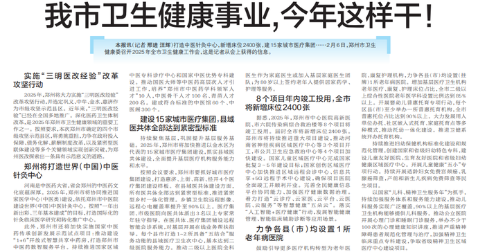 打造中医针灸中心,新增床位2400张,建15家城市医疗集团……2月6日,郑州市卫生健康委召开2025年全市卫生健康工作会,这是记者从会上获得的信息。(今日《郑州日报》3版)
