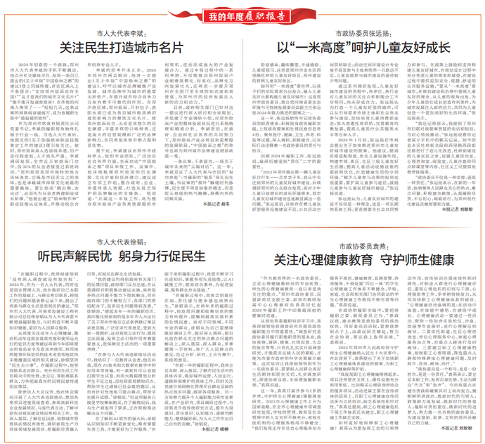 “作为教育界的一名政协委员,立足心理健康教研员的专业优势,师生的心理健康教育一直以来是我关注的重点。”郑州市政协委员、民盟新郑总支副主委、新郑市教师发展中心心理教研员袁燕回忆起2024年履职工作中印象最深刻的提案时说道。(今日《郑州日报》3版)