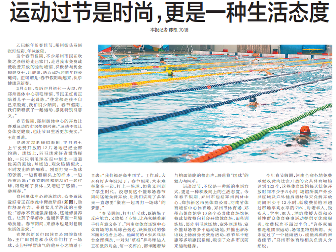 这个春节假期,不少郑州市民在欢聚之余纷纷走出家门,走进我市免费或低收费开放的运动场馆,积极参与到全民健身中,让健康、活力成为迎新年的关键词。正可谓是:春节假期动起来,快乐健康迎新春。(今日《郑州日报》5版)