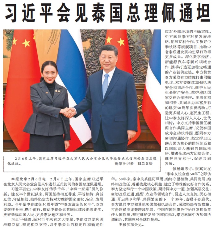2月6日上午,国家主席习近平在北京人民大会堂会见来华进行正式访问的泰国总理佩通坦。