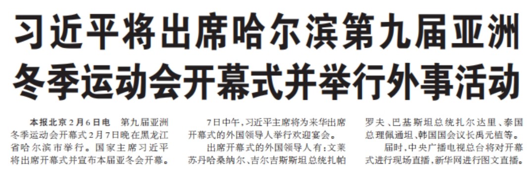 第九届亚洲冬季运动会开幕式2月7日晚在黑龙江省哈尔滨市举行。国家主席习近平将出席开幕式并宣布本届亚冬会开幕。(今日《人民日报》1版)