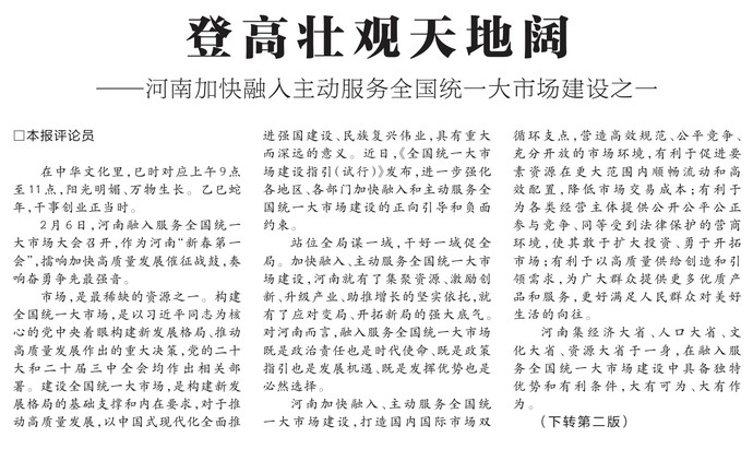 2月6日,河南融入服务全国统一大市场大会召开,作为河南“新春第一会”,擂响加快高质量发展催征战鼓,奏响奋勇争先最强音。(今日《河南日报》1版、2版)