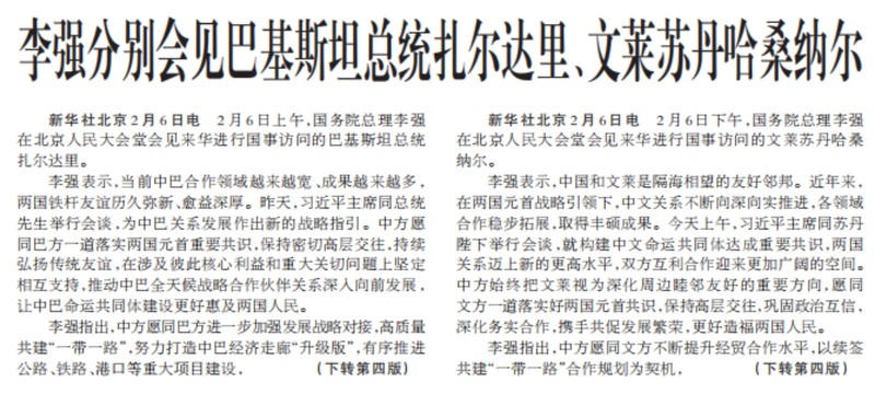 2月6日上午,国务院总理李强在北京人民大会堂会见来华进行国事访问的巴基斯坦总统扎尔达里。(今日《人民日报》1版、4版)
