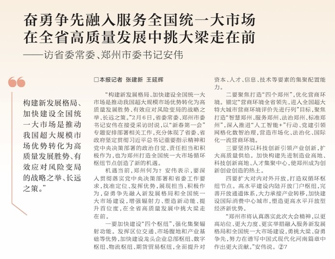 “构建新发展格局、加快建设全国统一大市场是推动我国超大规模市场优势转化为高质量发展胜势、有效应对风险变局的战略之举、长远之策。”2月6日,省委常委、郑州市委书记安伟在接受采访时说,以“新春第一会”专题安排部署相关工作,充分体现了省委、省政府坚定贯彻习近平总书记重要指示精神和党中央决策部署的政治自觉、责任担当和积极作为,也为郑州打造全国统一大市场循环枢纽节点创造了新的机遇。(今日《河南日报》4版)