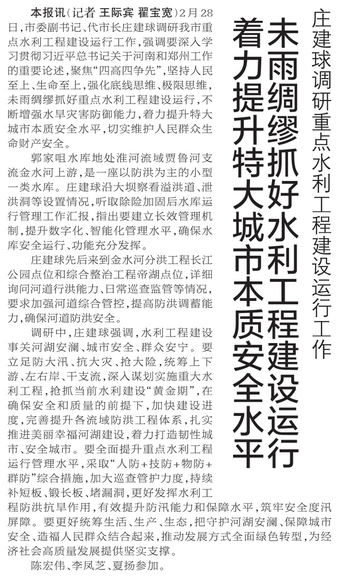 2月28日,市委副书记、代市长庄建球调研我市重点水利工程建设运行工作,强调要深入学习贯彻习近平总书记关于河南和郑州工作的重要论述,聚焦“四高四争先”,坚持人民至上、生命至上,强化底线思维、极限思维,未雨绸缪抓好重点水利工程建设运行,不断增强水旱灾害防御能力,着力提升特大城市本质安全水平,切实维护人民群众生命财产安全。(今日《郑州日报》1版)