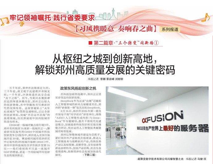 五千年前,黄帝在此铸鼎定九州;三千年前,商王朝于此建都开青铜文明;一千年前,汴洛商道在此交会成“天下之枢”。而今,当黄河水裹挟着历史的厚重奔腾向东,郑州正以惊人的创新势能,在中华腹地书写着新时代的突围传奇。这座曾被贴上“火车拉来城市”标签的交通枢纽,正以全新的创新密码,突破“不沿边不沿海”的地理围城,向世界展现中国内陆城市的进化样本。(今日《郑州日报》1版、2版)