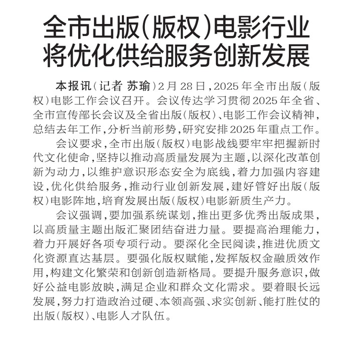 2月28日,2025年全市出版(版权)电影工作会议召开。会议传达学习贯彻2025年全省、全市宣传部长会议及全省出版(版权)、电影工作会议精神,总结去年工作,分析当前形势,研究安排2025年重点工作。(今日《郑州日报》2版)