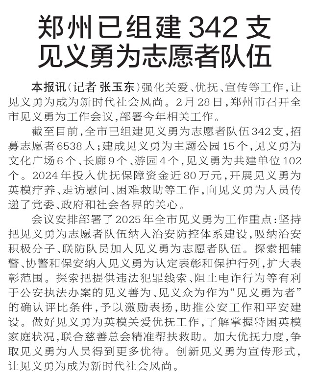 强化关爱、优抚、宣传等工作,让见义勇为成为新时代社会风尚。2月28日,郑州市召开全市见义勇为工作会议,部署今年相关工作。(今日《郑州日报》2版)