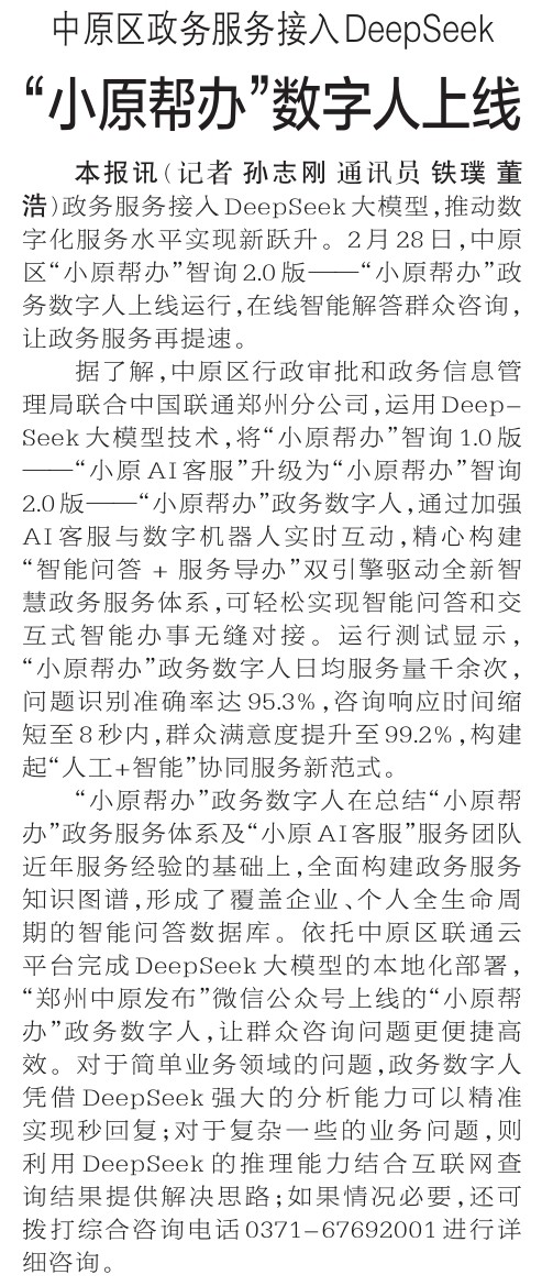 政务服务接入DeepSeek大模型,推动数字化服务水平实现新跃升。2月28日,中原区“小原帮办”智询2.0版——“小原帮办”政务数字人上线运行,在线智能解答群众咨询,让政务服务再提速。(今日《郑州日报》2版)