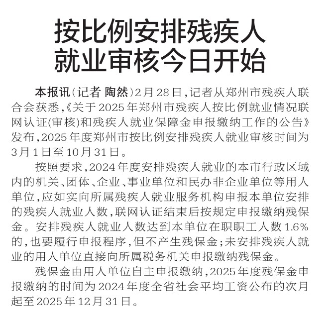 2月28日,记者从郑州市残疾人联合会获悉,《关于2025年郑州市残疾人按比例就业情况联网认证(审核)和残疾人就业保障金申报缴纳工作的公告》发布,2025年度郑州市按比例安排残疾人就业审核时间为3月1日至10月31日。(今日《郑州日报》2版)