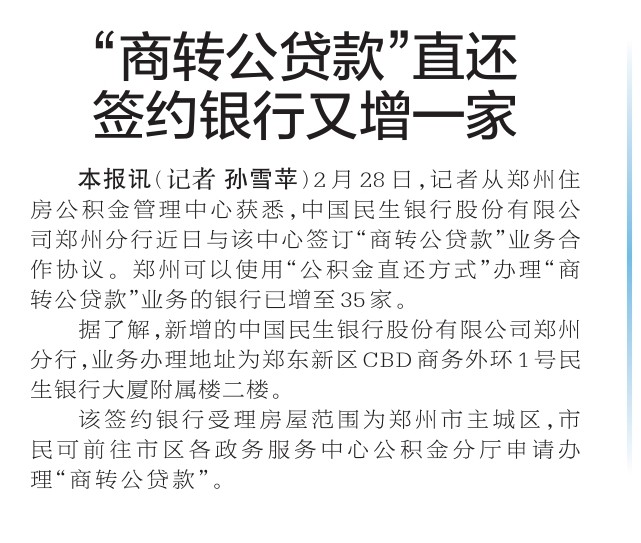 2月28日,记者从郑州住房公积金管理中心获悉,中国民生银行股份有限公司郑州分行近日与该中心签订“商转公贷款”业务合作协议。郑州可以使用“公积金直还方式”办理“商转公贷款”业务的银行已增至35家。(今日《郑州日报》2版)